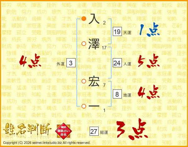 生活面を象徴する運勢です。外部から受ける影響力を表し、結婚運、家庭運や職場、環境への順応性を表します。総運から人運を引いた画数。姓や名が1文字の場合を除く。
