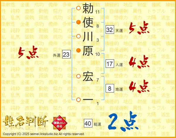 勅(11画)使(8画)川(3画)原(10画) 宏(7画)一(1画)