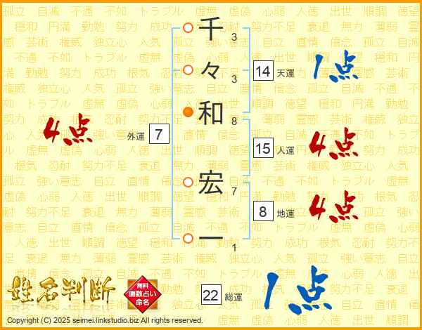 千(3画)々(3画)和(8画) 宏(7画)一(1画)