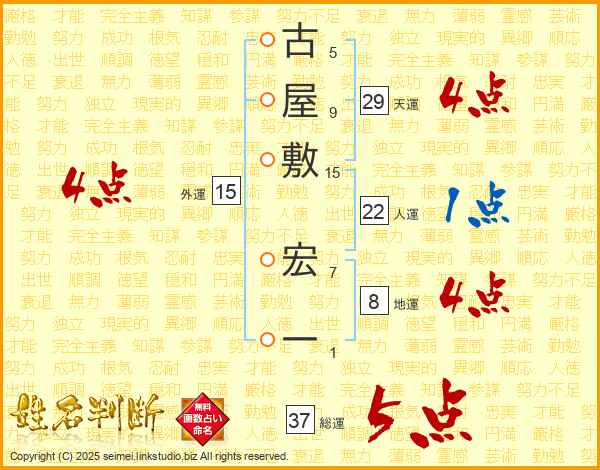 古(5画)屋(9画)敷(15画) 宏(7画)一(1画)
