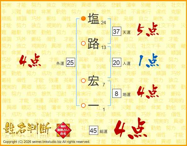 塩路宏一さんの総運は45画の4点!