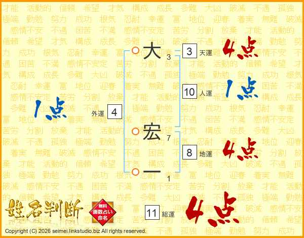 生活面を象徴する運勢です。外部から受ける影響力を表し、結婚運、家庭運や職場、環境への順応性を表します。総運から人運を引いた画数。姓や名が1文字の場合を除く。