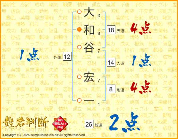 生活面を象徴する運勢です。外部から受ける影響力を表し、結婚運、家庭運や職場、環境への順応性を表します。総運から人運を引いた画数。姓や名が1文字の場合を除く。