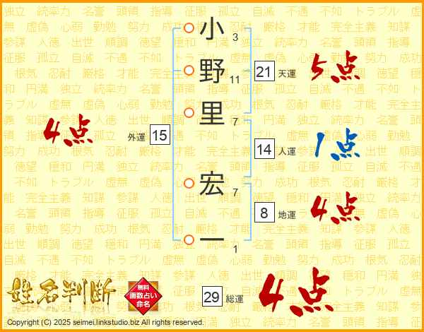 小(3画)野(11画)里(7画) 宏(7画)一(1画)
