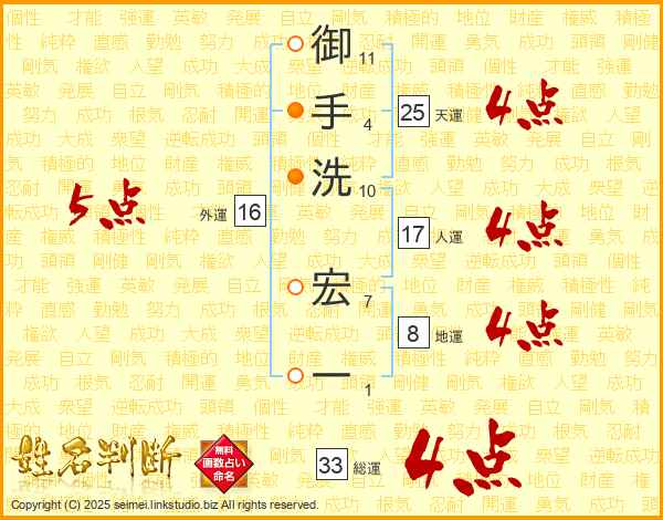 御(11画)手(4画)洗(10画) 宏(7画)一(1画)