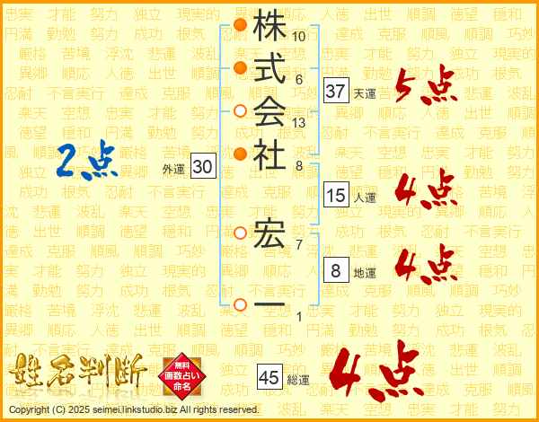 株(10画)式(6画)会(13画)社(8画) 宏(7画)一(1画)