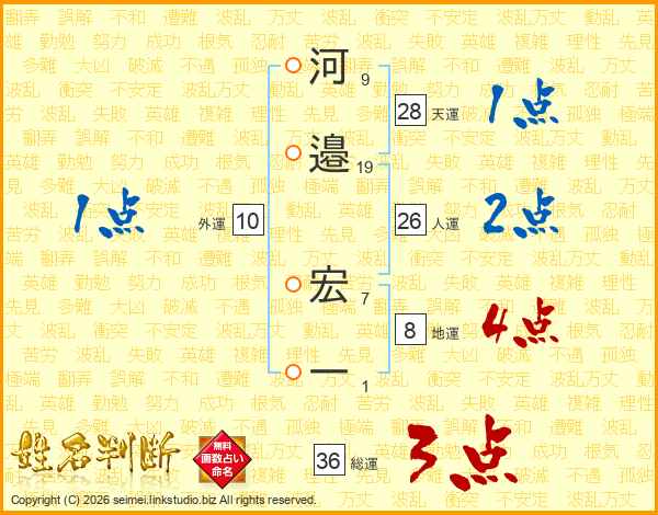 画数の奇数(○陽)と偶数(●陰)の配列で吉凶を占います。どちらかにかたよる名前は大凶名で避ける必要があります。画数の奇数偶数。