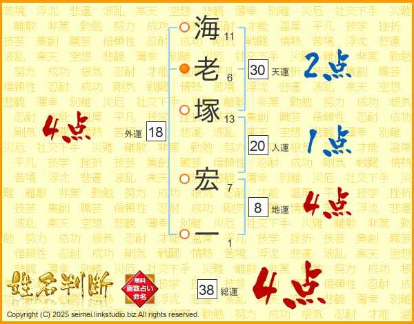 海(11画)老(6画)塚(13画) 宏(7画)一(1画)