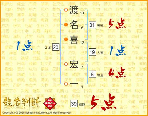 渡名喜宏一さんの総運は39画の5点!