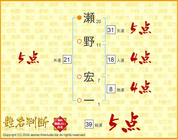 瀬(20画)野(11画) 宏(7画)一(1画)