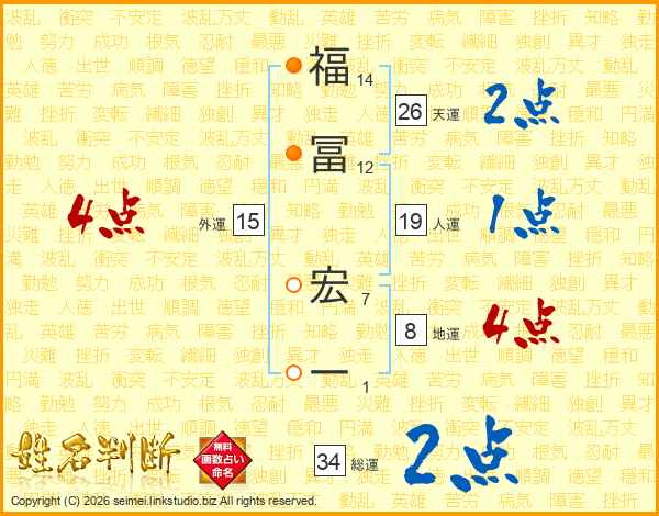 生活面を象徴する運勢です。外部から受ける影響力を表し、結婚運、家庭運や職場、環境への順応性を表します。総運から人運を引いた画数。姓や名が1文字の場合を除く。