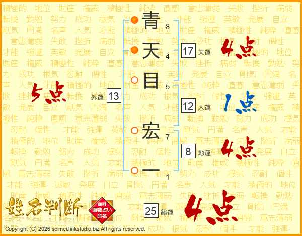 青(8画)天(4画)目(5画) 宏(7画)一(1画)