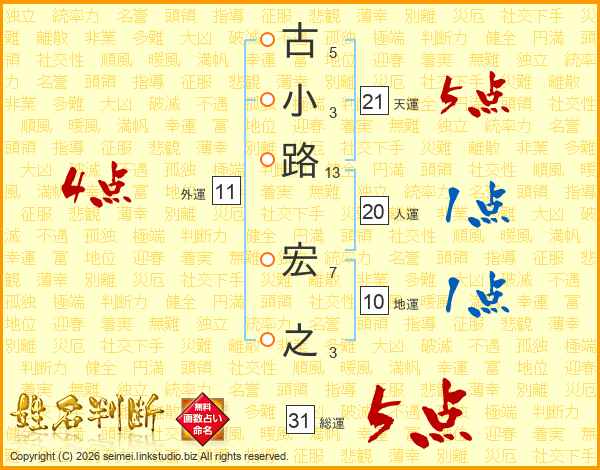 古小路宏之さんの総運は31画の5点!