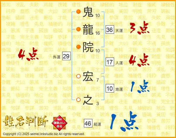 鬼(10画)龍(16画)院(10画) 宏(7画)之(3画)