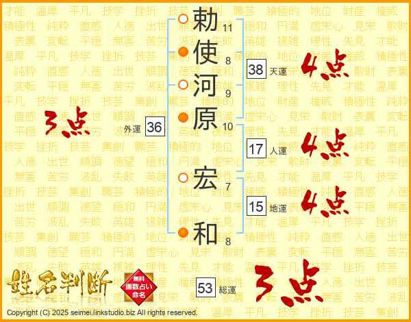 勅(11画)使(8画)河(9画)原(10画) 宏(7画)和(8画)