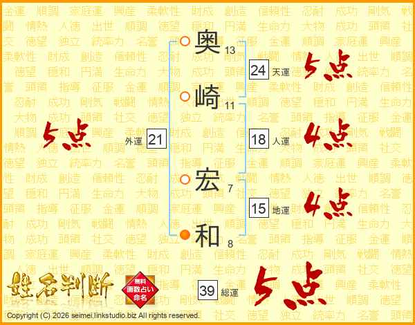 奥崎宏和さんの総運は39画の5点!