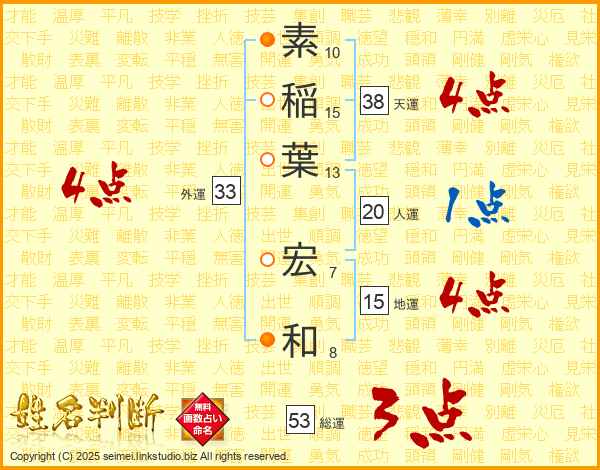 素(10画)稲(15画)葉(13画) 宏(7画)和(8画)