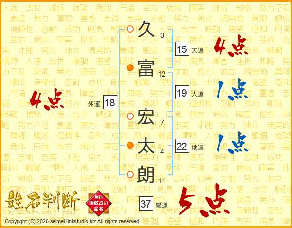 久(3画)富(12画) 宏(7画)太(4画)朗(11画)