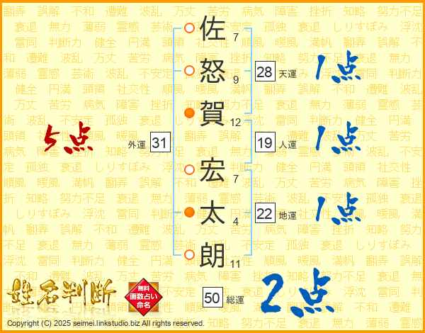 佐怒賀宏太朗さんの地運は22画の1点!