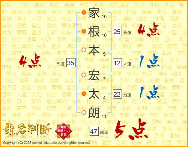 家(10画)根(10画)本(5画) 宏(7画)太(4画)朗(11画)
