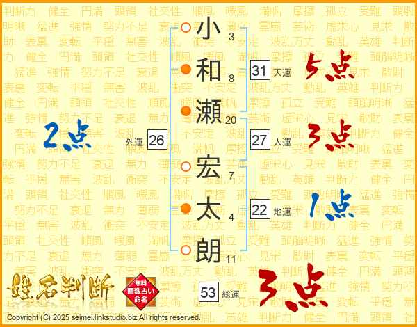 小(3画)和(8画)瀬(20画) 宏(7画)太(4画)朗(11画)