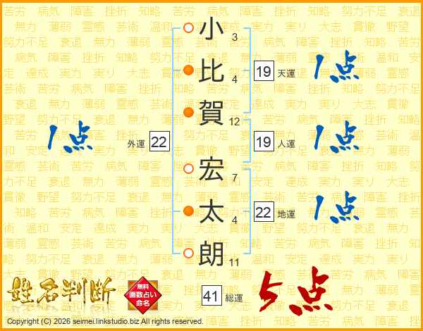 小(3画)比(4画)賀(12画) 宏(7画)太(4画)朗(11画)