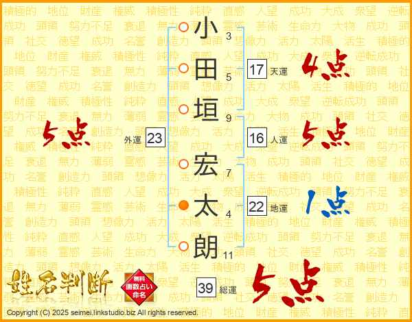 小田垣宏太朗さんの総運は39画の5点!