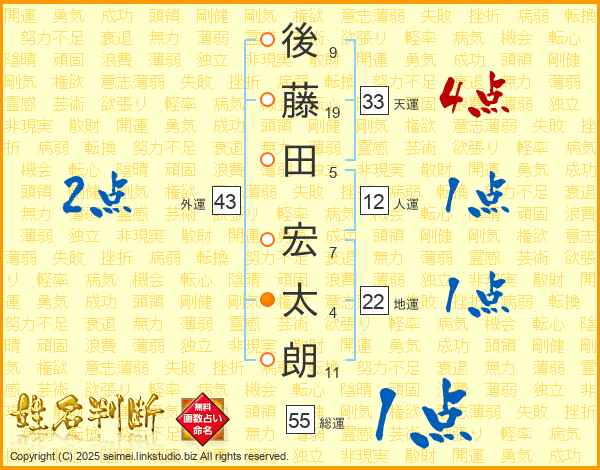 後(9画)藤(19画)田(5画) 宏(7画)太(4画)朗(11画)
