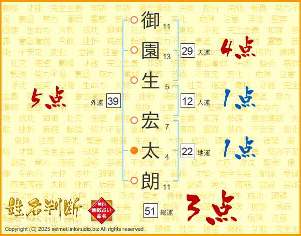 御(11画)園(13画)生(5画) 宏(7画)太(4画)朗(11画)