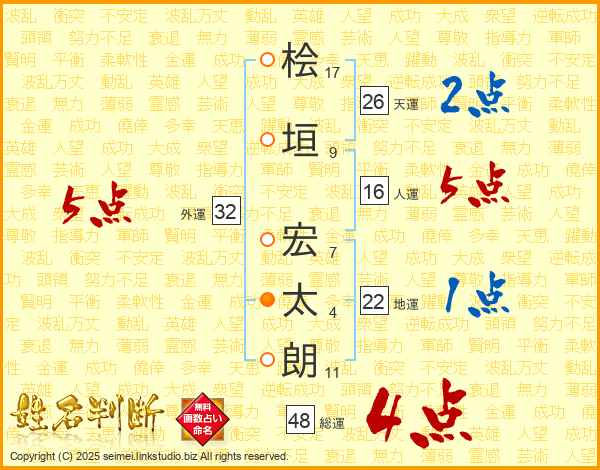 桧(17画)垣(9画) 宏(7画)太(4画)朗(11画)