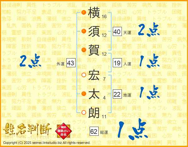 横(16画)須(12画)賀(12画) 宏(7画)太(4画)朗(11画)