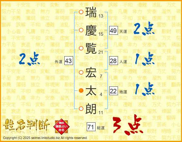 瑞(13画)慶(15画)覧(21画) 宏(7画)太(4画)朗(11画)
