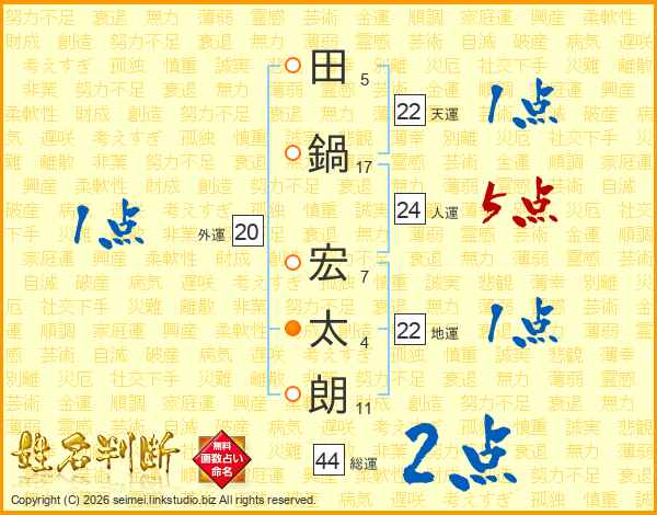 田(5画)鍋(17画) 宏(7画)太(4画)朗(11画)