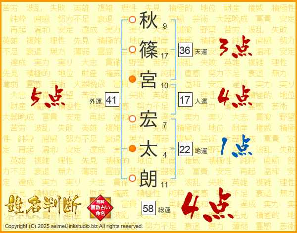 秋(9画)篠(17画)宮(10画) 宏(7画)太(4画)朗(11画)