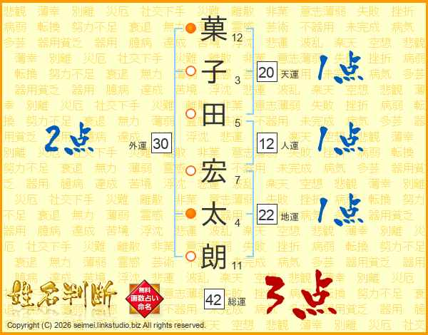 菓(12画)子(3画)田(5画) 宏(7画)太(4画)朗(11画)