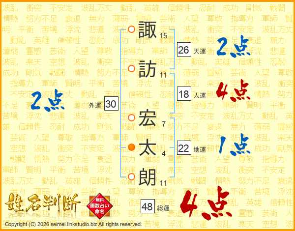 諏(15画)訪(11画) 宏(7画)太(4画)朗(11画)