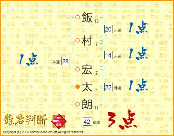 飯(13画)村(7画) 宏(7画)太(4画)朗(11画)