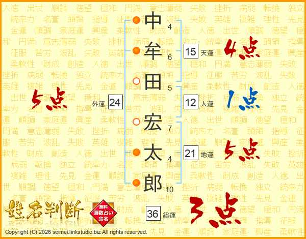 中(4画)牟(6画)田(5画) 宏(7画)太(4画)郎(10画)