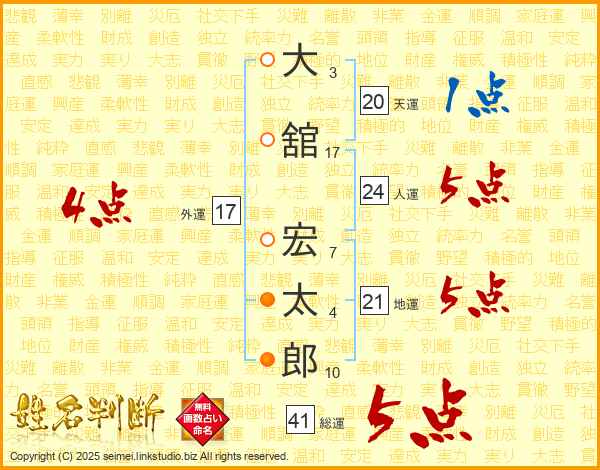 大(3画)舘(17画) 宏(7画)太(4画)郎(10画)