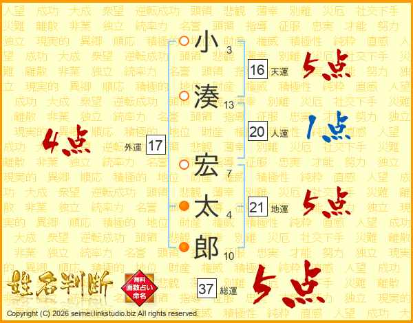 小湊宏太郎さんの総運は37画の5点!