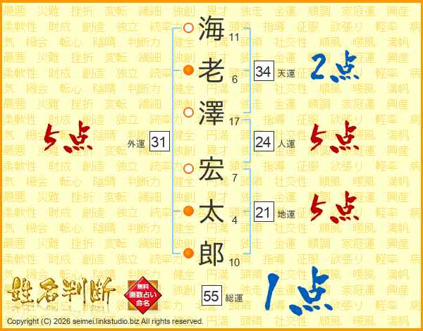海(11画)老(6画)澤(17画) 宏(7画)太(4画)郎(10画)