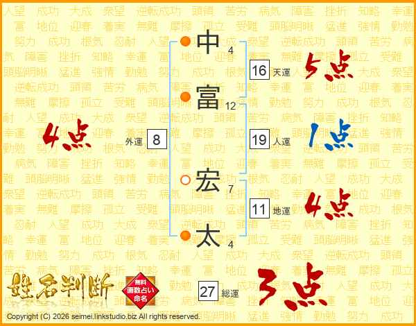 あなたの人生を表す1番重要な運勢です。生涯を通じて影響する総合運となり、主に50歳以降の晩年期に影響を及ぼします。苗字と名前の合計画数。