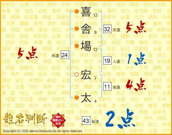 喜(12画)舎(8画)場(12画) 宏(7画)太(4画)