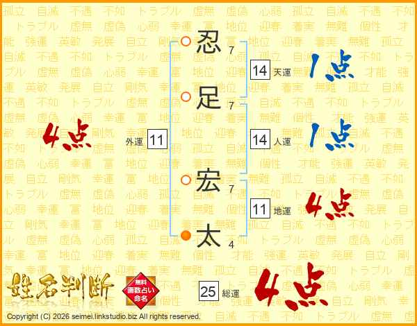 忍(7画)足(7画) 宏(7画)太(4画)