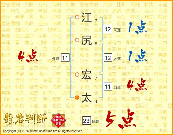 江(7画)尻(5画) 宏(7画)太(4画)