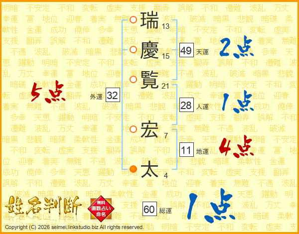 瑞(13画)慶(15画)覧(21画) 宏(7画)太(4画)