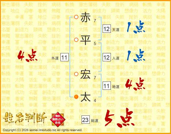 赤(7画)平(5画) 宏(7画)太(4画)