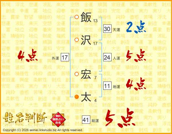 飯沢宏太さんの総運は41画の5点!