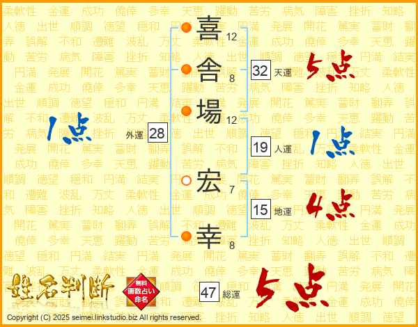 喜(12画)舎(8画)場(12画) 宏(7画)幸(8画)