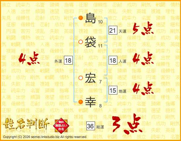 島(10画)袋(11画) 宏(7画)幸(8画)